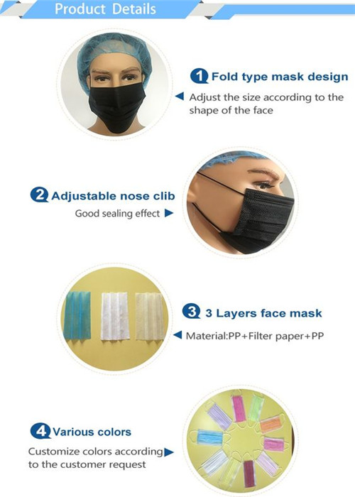 Black Chemical Protective Face Mask , Disposable Earloop Face Mask Economical Product descriptions: Item Black chemical protective non woven Disposable face mask Filtration efficiency B.F.E≥ 95 / 99% PFE ≥ 99% Material Non woven + Filter Paper + Nonwoven Gram weight 18 + 20 + 25 gsm, 20 + 22 + 25 gsm 35 + 25 + 25 gsm or customized as your requirments Size 12.5 x 8 cm for chrildren 2-6 years old 14.5 x 9 cm for chrildren 6-12 years old 17.5 x 9.5 cm for adult Color White, blue